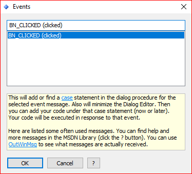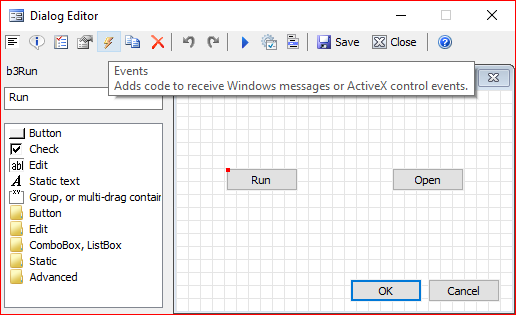 on the dialog editor window select the control(button in this case) you want to execute code from